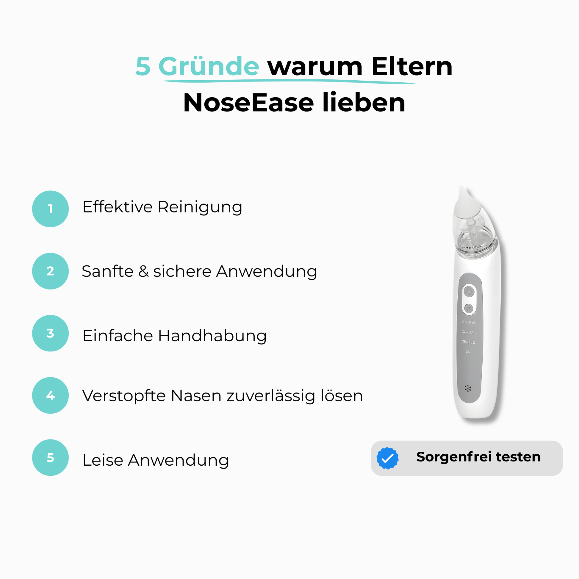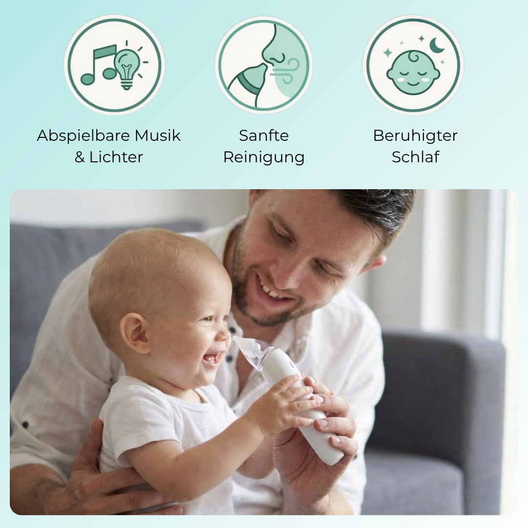 Mit NoseEase befreist du die Nase deines Babys schnell, sanft und zuverlässig von Schleim. So kann dein kleiner Schatz wieder frei atmen und fühlt sich rundum wohl.