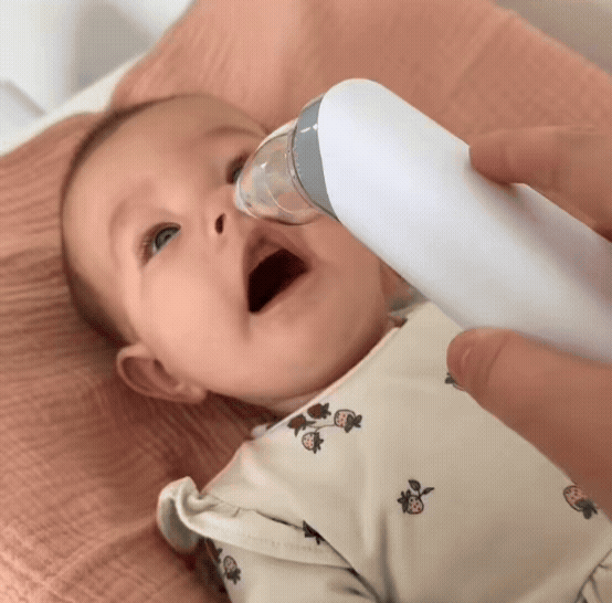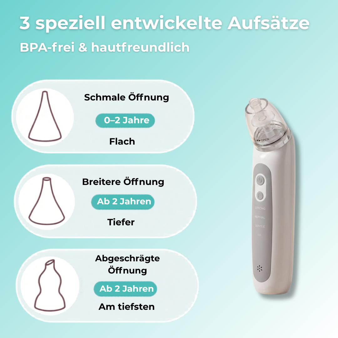 Der elektrische Nasensauger erzeugt eine sanfte, aber gezielte Saugkraft, die Schleim und Verstopfungen aus der Nase deines Babys entfernt.